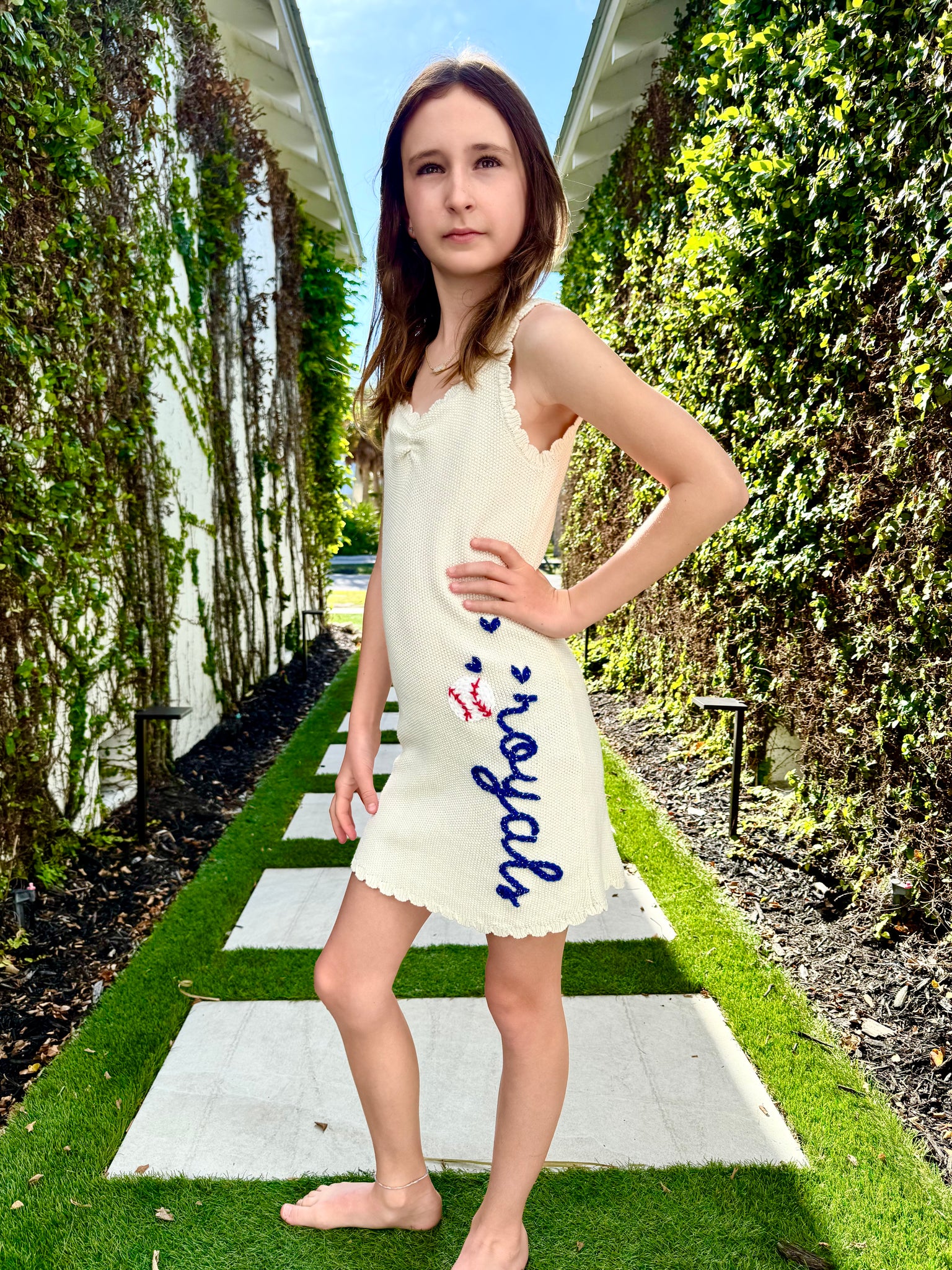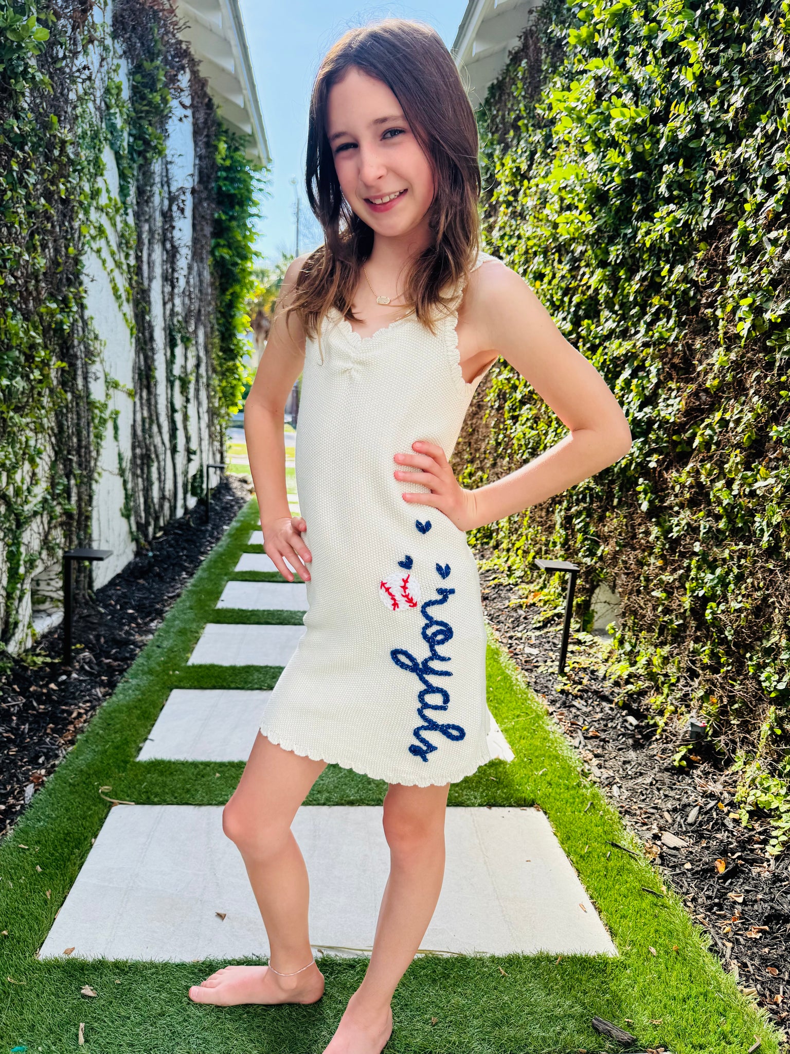 This timeless knit dress is incredibly beautiful with the hand embroidered lettering and embroidered baseball! Be one of the few to own this stunning piece. Made to order!