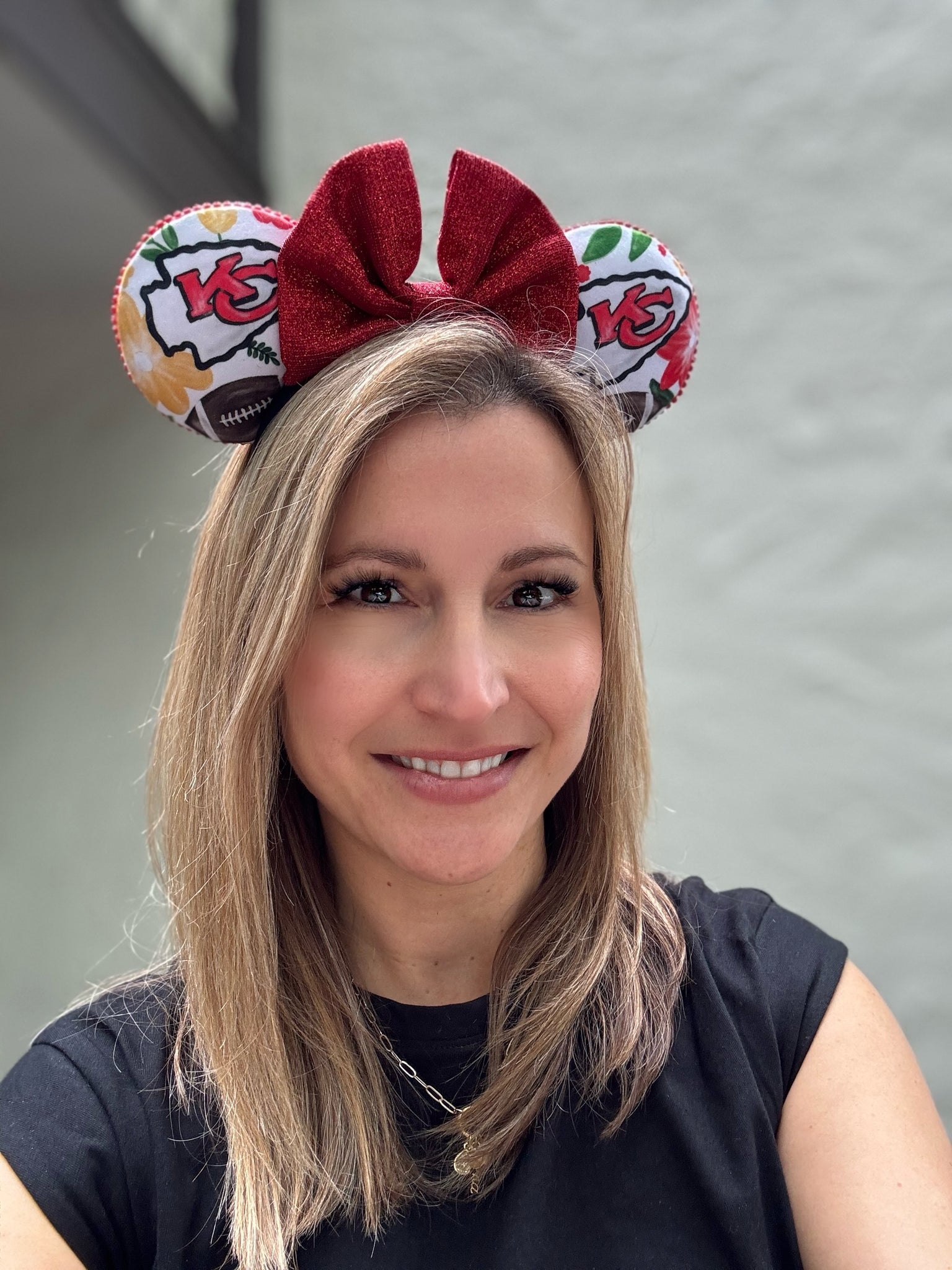 No trip to the land of magic is complete without a set of ears showing America's favorite team! These are handmade just like the soft and squishy ears you'd find in a shop! the bow sparkles and the ears are trimmed with red sparkling rhinestones too!